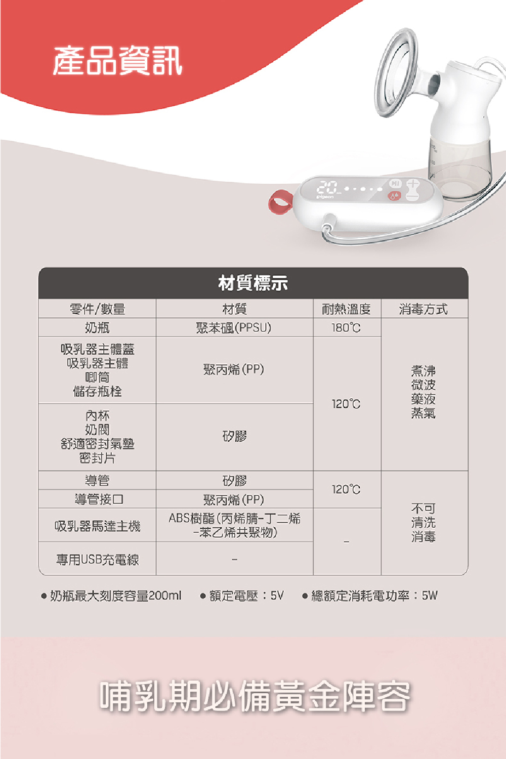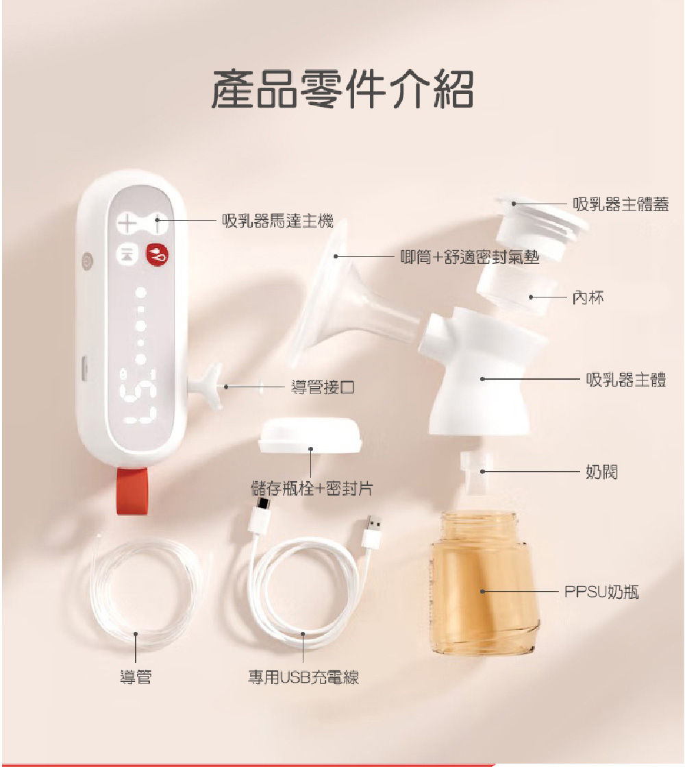 200mlPPSU奶瓶x1、吸乳器主體蓋x1、吸乳器主體x1、唧筒x1、儲存瓶栓x1、內杯x1、奶閥x3、舒適密封氣墊x1、密封片x1、導管x1、導管接口x1、吸乳器馬達主機x1、專用USB充電線x1